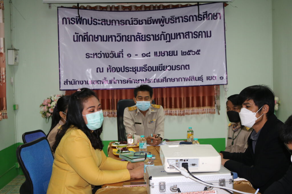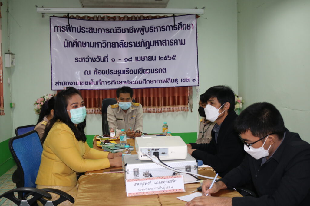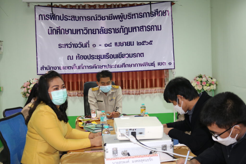 นายสมเกียรติ ภูโอบ ผู้อำนวยการกลุ่มอำนวยการ พร้อมบุคลากรกลุ่มอำนวยการเป็นวิทยากรให้ความรู้กับนิสิตฝึกประสบการณ์วิชาชีพบริหารการศึกษา ณ ห้องประชุมเรือนเขียวมรกต สำนักงานเขตพื้นที่การศึกษาประถมศึกษากาฬสินธุ์ เขต 1
