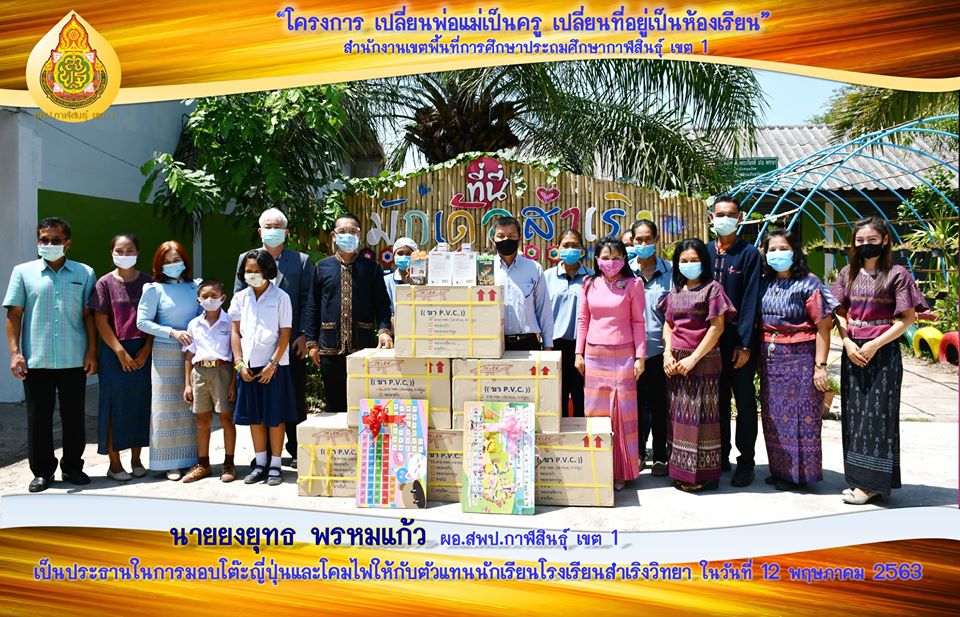 นายยงยุทธ พรหมแก้ว ผอ.สพป.กส.1 มอบโต๊ะญี่ปุ่น-โคมไฟให้กับนักเรียน โรงเรียนสำเริงวิทยา อำเภอร่องคำ จังหวัดกาฬสินธุ์ ตามโครงการ เปลี่ยนพ่อแม่เป็นครูเปลี่ยนที่อยู่เป็นห้องเรียนโดยมีวัตถุประสงค์ เพื่อ