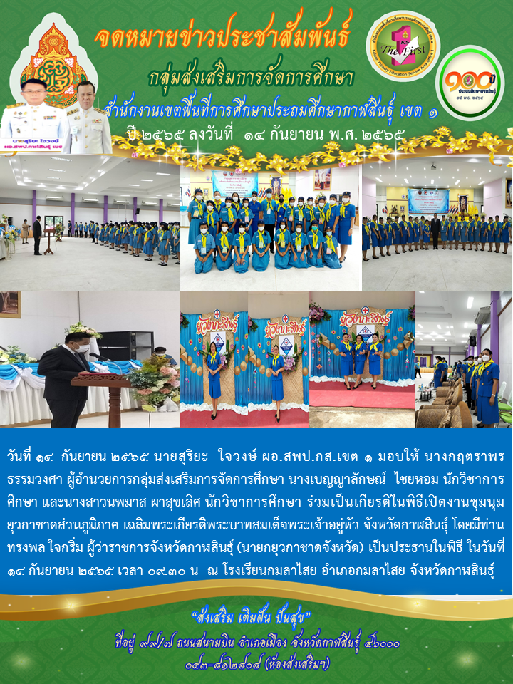 ข่าวประชาสัมพันธ์ จดหมายข่าวกลุ่ม พิธีเปิดงานชุมนุมยุวกาชาดส่วนภูมิภาค เฉลิมพระเกียรติพระบาทสมเด็จพระเจ้าอยู่หัว จังหวัดกาฬสินธุ์ ณ โรงเรียนกมลาไสย อำเภอกมลาไสย จังหวัดกาฬสินธุ์ 14 กันยายน 202214 กันยายน 2022 admin 0 Comments FacebookTwitterLine