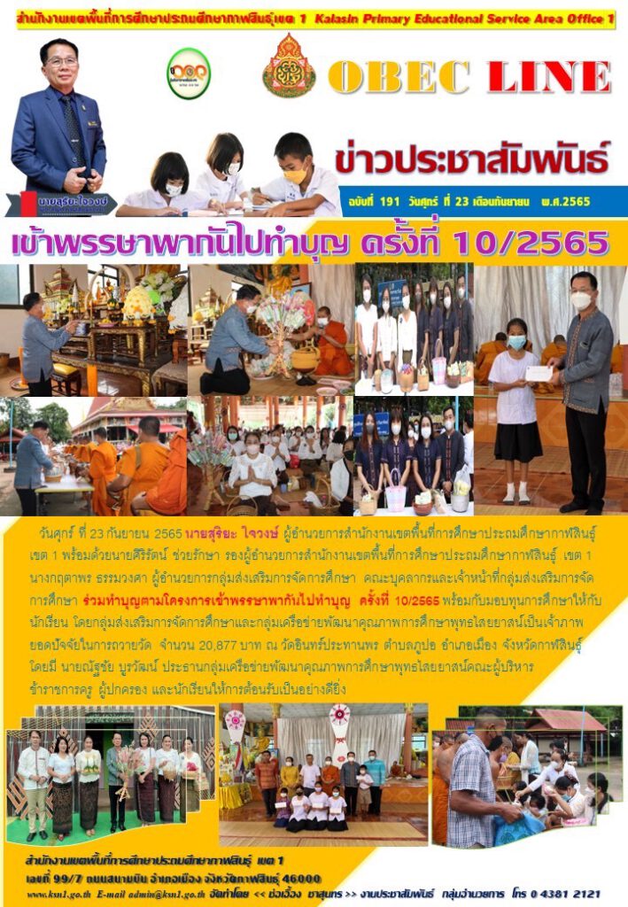 นายสุริยะ ใจวงษ์ ผอ.สพป.กาฬสินธุ์ เขต 1 พร้อมด้วยนายศิริรัตน์ ช่วยรักษา รองผอ.สพป.กาฬสินธุ์ เขต 1 นางกฤตาพร ธรรมวงศา ผอ.กลุ่มส่งเสริมการจัดการศึกษา คณะบุคลากรและเจ้าหน้าที่กลุ่มส่งเสริมการจัดการศึกษา ร่วมทำบุญตามโครงการเข้าพรรษา พากันไปทำบุญ ครั้งที่ 10/2565 พร้อมกับมอบทุน การศึกษาให้กับนักเรียน