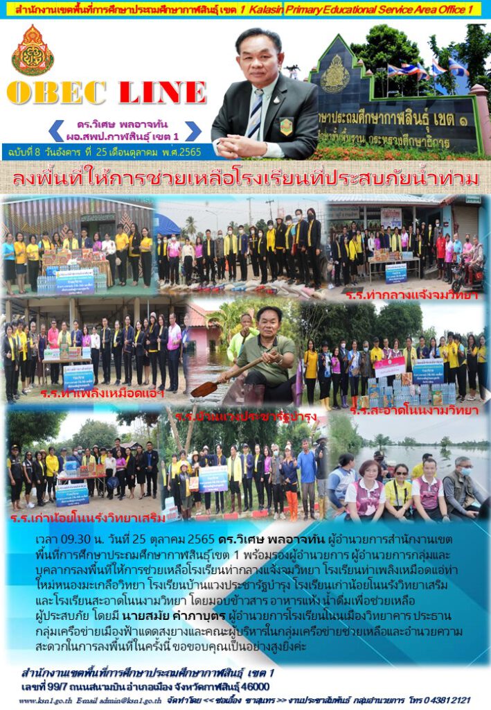 25 ตุลาคม 2565 ดร.วิเศษ พลอาจทัน ผอ.สพป.กาฬสินธุ์ เขต 1 ได้นำบุคลากรในสังกัด นำข้าวสาร อาหารแห้ง นำ้ดื่ม และเสื้อผ้า ที่ได้รับบริจาคจากบุคลากรในสพป.กาฬสินธุ์ เขต 1 ภายใต้โครงการสำนักงานเขตพื้นที่การศึกษาคุณธรรม (องค์กรคุณธรรม) ต้นแบบ ลงพื้นที่ให้กำลังใจโรงเรียนที่ประสบภัยน้ำท่วม อำเภอกมลาไสย จำนวน 5 โรงเรียน