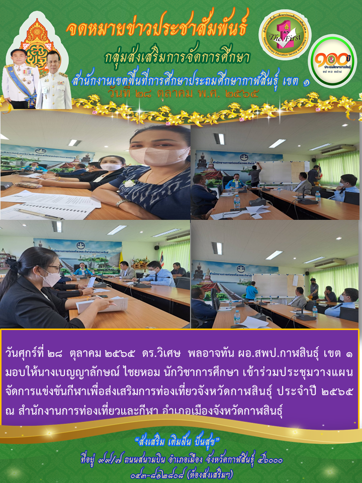 วันศุกร์ที่ 28 ตุลาคม 2565 ดร.วิเศษ พลอาจทัน ผอ.สพป.กาฬสินธุ์ เขต 1 มอบให้ นางเบญญาลักษณ์ ไชยหอม นักวิชาการศึกษาเข้าร่วมประชุมวางแผนจัดการแข่งขันกีฬาเพื่อส่งเสริมการท่องเที่ยวจังหวัดกาฬสินธุ์ ประจำปี 2565 ณ สำนักงานการท่องเที่ยวและกีฬา อำเภอเมืองจังหวัดกาฬสินธุ์