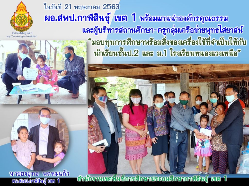 เมื่อวันที่ 21 พฤษภาคม 2563 สพป.กาฬสินธุ์ เขต 1 นายยงยุทธ พรหมแก้ว ผอ.สพป.กาฬสินธุ์ เขต 1 พร้อมด้วยเจ้าหน้าที่ศูนย์ ฉก.ชน.สพป.กาฬสินธุ์ เขต 1 บุคลากรและภาคีเครือข่ายได้ลงพื้นที่มอบเงินช่วยเหลือ พร้อมสิ่งของเครื่องใช้ที่จำเป็นให้กับนักเรียนราย เด็กหญิงพรทิพย์ โสภีร์ ชั้นประถมศึกษาปีที่ 2 และเด็กหญิงรัตนา โสภีร์ ชั้นมัธยมศึกษาปีที่ 1 ทั้งสองคนเป็นพี่น้องกัน พ่อแม่หย่าร้าง อาศัยอยู่กับยายที่แก่ชราแล้วไม่มีอาชีพ มีโรคประจำตัว รายได้หลักได้มาจากแม่ที่ทำงานอยู่จังหวัดปทุมธานี ซึ่งมีรายได้ไม่แน่นอน อาศัยอยู่บ้านเช่าในหมู่บ้านหนองแวงเหนือ ตำบลภูปอ อำเภอเมืองกาฬสินธุ์ จังหวัดกาฬสินธุ์ โดยต้องจ่ายค่าเช่าบ้านเดือนละ 500 บาท และต้องเดินทางไปขอข้าวและอาหารที่สำนักสงฆ์ใกล้บ้านพักเพื่อดำรงชีวิต เป็นประจำทุกวัน