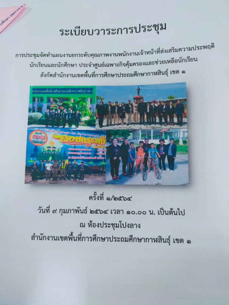 วันที่ 9 กุมภาพันธ์ 2564 ดร.วิเศษ พลอาจทัน ผอ.สพป.กาฬสินธุ์ เขต 1 มอบหมายให้ นายศิริรัตน์ ช่วยรักษา รอง ผอ.สพป.กาฬสินธุ์ เขต 1 เป็นประธานการประชุมจัดทำแผนงานยกระดับคุณภาพงานพนักงานเจ้าหน้าที่ส่งเสริมความประพฤตินักเรียนและนักศึกษา (พสน.) ประจำศูนย์เฉพาะกิจคุ้มครองและช่วยเหลือนักเรียน ในสังกัด สพป.กาฬสินธุ์ เขต 1 ณ ห้องประชุมโปงลาง สพป.กาฬสินธุ์ เขต 1 โดยมีเครือข่าย พสน.ประจำอำเภอทั้ง 6 แห่ง ได้แก่ เมืองกาฬสินธุ์ กมลาไสย ร่องคำ ดอนจาน สหัสขันธ์และสามชัย พร้อมด้วยเจ้าหน้าที่กลุ่มส่งเสริมการจัดการศึกษาเข้าร่วมประชุมจัดทำแผนงานดังกล่าว ในปีงบประมาณ 2564 โดยพร้อมเพรียง
