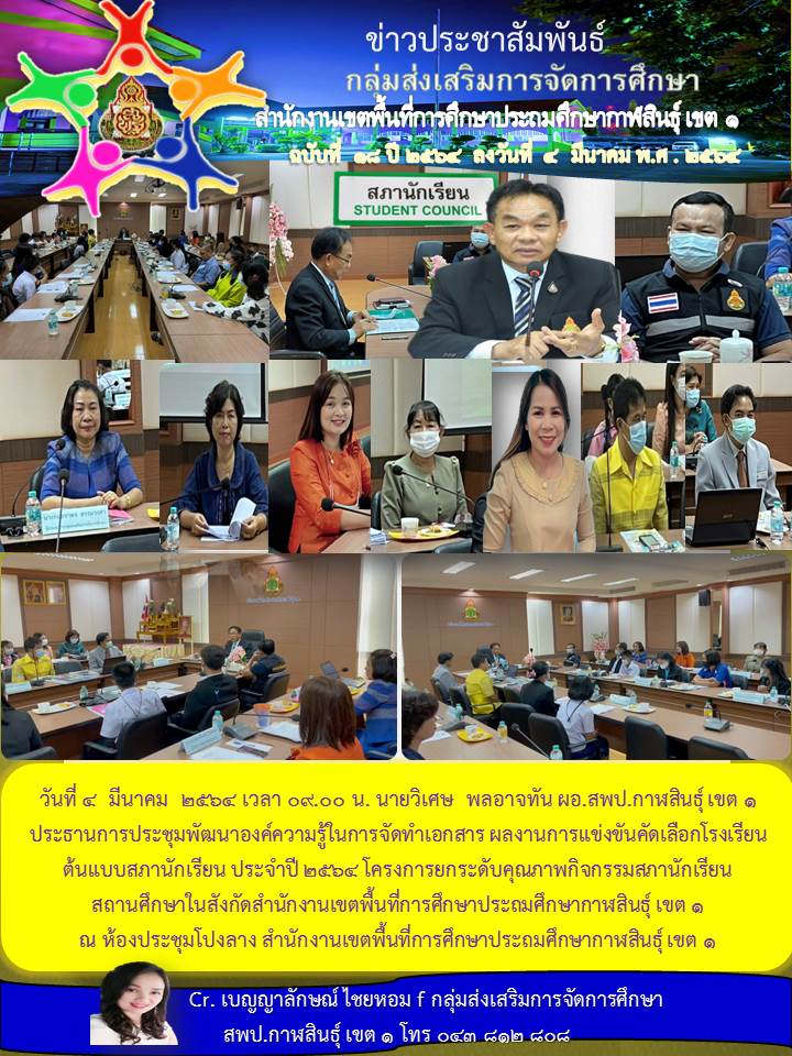 วันที่ 4 มีนาคม 2564 เวลา 09.00 น. นายวิเศษ พลอาจทัน ผอ.สพป.กาฬสินธุ์ เขต 1 ประธานการประชุมพัฒนาองค์ความรู้ในการจัดทำเอกสาร ผลงานการแข่งขันคัดเลือกโรงเรียนต้นแบบสภานักเรียน ประจำปี 2564 โครงการยกระดับคุณภาพกิจกรรมสภานักเรียนสถานศึกษาในสังกัดสำนักงานเขตพื้นที่การศึกษาประถมศึกษากาฬสินธุ์ เขต 1 ณ ห้องประชุมโปงลาง สำนักงานเขตพื้นที่การศึกษาประถมศึกษากาฬสินธุ์ เขต 1