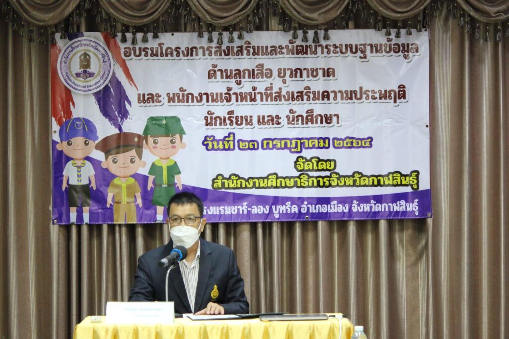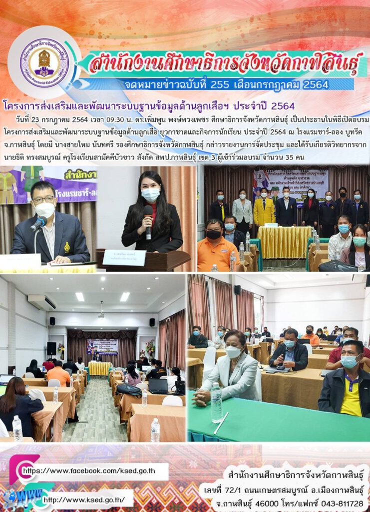 ในวันที่ 23 กรกฎาคม 2564 เวลา 09.30 น. โดยมีดร.เพิ่มพูน พงษ์พวงเพชร ศึกษาธิการจังหวัดกาฬสินธุ์ เป็นประธานในพิธีเปิดอบรมโครงการส่งเสริมและพัฒนาระบบฐานข้อมูลด้านลูกเสือ ยุวกาชาดและกิจการนักเรียน ประจำปี 2564 ณ โรงแรมชาร์-ลอง บูทรีค จ.กาฬสินธุ์ โดยมี นางสายใหม นันทศรี รองศึกษาธิการจังหวัดกาฬสินธุ์ กล่าวรายงานการจัดประชุม และได้รับเกียรติวิทยากรจาก นายธิติ ทรงสมบูรณ์ ครูโรงเรียนสามัคคีบัวขาว สังกัด สพป.กาฬสินธุ์ เขต 3 ผู้เข้าร่วมอบรม จำนวน 35 คน