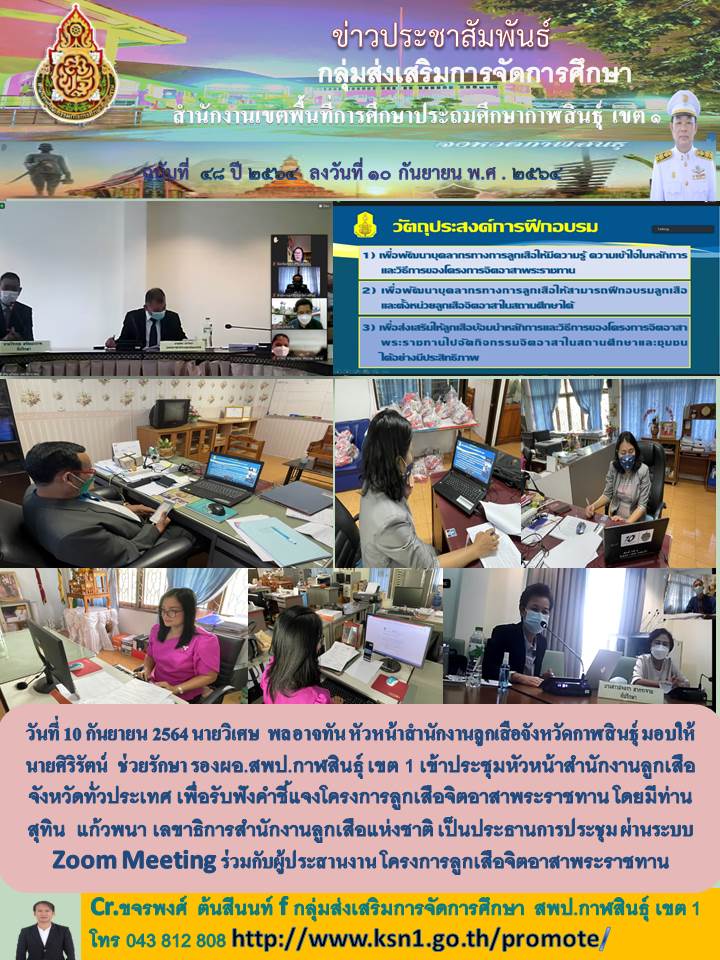 วันที่ 10 กันยายน 2564 นายวิเศษ พลอาจทัน หัวหน้าสำนักงานลูกเสือจังหวัดกาฬสินธุ์ มอบให้นายศิริรัตน์ ช่วยรักษา รองผอ.สพป.กาฬสินธุ์ เขต 1 เข้าประชุมหัวหน้าสำนักงานลูกเสือจังหวัดทั่วประเทศ เพื่อรับฟังคำชี้แจงโครงการลูกเสือจิตอาสาพระราชทาน โดยมีท่าน สุทิน แก้วพนา เลขาธิการสำนักงานลูกเสือแห่งชาติ เป็นประธานการประชุม ผ่านระบบ Zoom Meeting ร่วมกับผู้ประสานงาน โครงการลูกเสือจิตอาสาพระราชทาน
