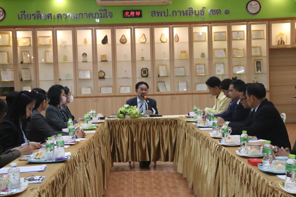 เวลา 10.00 น. วันที่ 18 ตุลาคม 2566 ดร.วิเศษ พลอาจทัน ผู้อำนวยการสำนักงานเขตพื้นที่การศึกษาประถมศึกษากาฬสินธุ์ เขต 1 และนางวชิรนุช พรหมภัทร์ รองผู้อำนวยการสำนักงานเขตพื้นที่การศึกษาประถมศึกษากาฬสินธุ์ เขต 1 ประชุมจัดทำบันทึกข้อตกลงในการปฏิบัติงานในหน้าที่ตำแหน่งผู้อำนวยการสถานศึกษา (MOU) ปี พ.ศ.2566 และพิธีลงนามบันทึกข้อตกลงในการปฏิบัติหน้าที่ ณ ห้องประชุมมูลนิธิถาวรจิตตถาวโร-วงศ์มาลัย สำนักงานเขตพื้นที่การศึกษาประถมศึกษากาฬสินธุ์ เขต 1