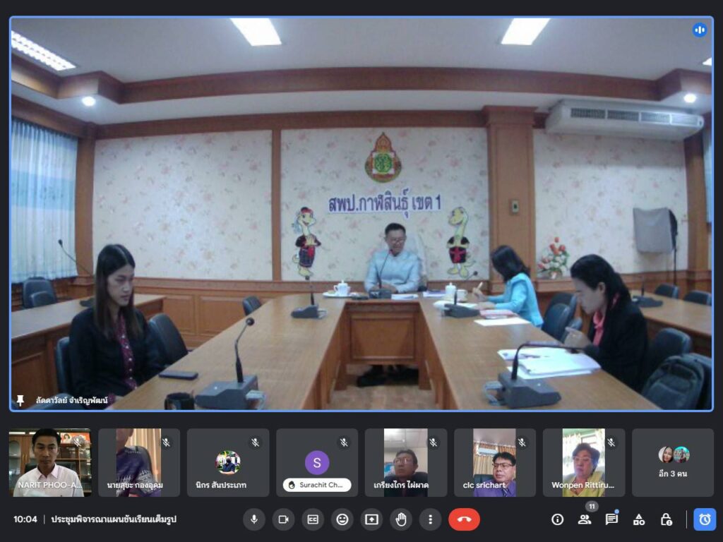 วันที่ 5 มกราคม 2567 ดร.วิเศษ พลอาจทัน ผอ.สพป.กาฬสินธุ์ เขต 1 มอบหมายให้ นายนุกูล ทรงมงคลรัตน์ รองผอ.สพป.กาฬสินธุ์ เขต 1 เป็นประธานดำเนินการประชุมคณะกรรมการพิจารณาแผนชั้นเรียนเต็มรูป ระยะ 5 ปี (ปีการศึกษา 2565-2569) และพิจารณาแผนชั้นเรียนรายปีของสถานศึกษาในสังกัด สพป.กาฬสินธุ์ เขต 1 ผ่านระบบ Google meet
