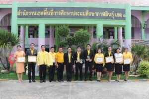 วันจันทร์ที่ 9 กันยายน 2567 เวลา 08.15 น. ดร.วิเศษ พลอาจทัน ผู้อำนวยการสำนักงานเขตพื้นที่การศึกษาประถมศึกษากาฬสินธุ์ เขต 1 นำบุคลากรเข้าแถวเคารพธงชาติ สวดมนต์ไหว้พระ และกล่าวคำปฏิญญาสำนักงานเขตพื้นที่การศึกษาสุจริต สนองนโยบายระยะเร่งด่วน (Quick Win) ประจำปีงบประมาณ พ.ศ. 2567 ด้านการลดภาระครูและบุคลากรทางการศึกษา ข้อ 5 สร้างความตระหนักในการป้องกันการทุจริต และมอบโล่รางวัลและเกียรติบัตรให้บุคลากรที่ได้รับรางวัลผลงานที่มีผลการปฏิบัติที่เป็นเลิศ (Best Practice) ระบบคลังสื่อเทคโนโลยีดิจิทัล (OBEC Content Center) ระดับเขตพื้นที่การศึกษา