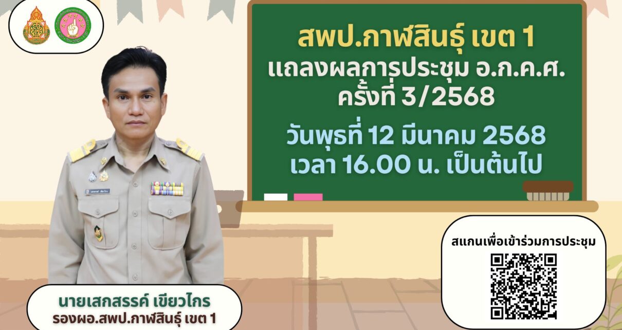 วันพุธที่ 12 มีนาคม 2568 เวลา 15.30 น. ว่าที่ร้อยตรี สุรสิทธิ์ ถิตย์สมบูรณ์ ผู้อำนวยการสำนักงานเขตพื้นที่การศึกษาประถมศึกษากาฬสินธุ์ เขต 1 มอบหมายให้ นายเสกสรรค์ เขียวไกร รองผู้อำนวยการสำนักงานเขตพื้นที่การศึกษาประถมศึกษากาฬสินธุ์ เขต 1 แถลงผลการประชุม อ.ก.ค.ศ. ครั้งที่ 3/2568 ผ่านระบบออนไลน์ (Zoom Meeting) ณ ห้องประชุมโปงลาง สำนักงานเขตพื้นที่การศึกษาประถมศึกษากาฬสินธุ์ เขต 1