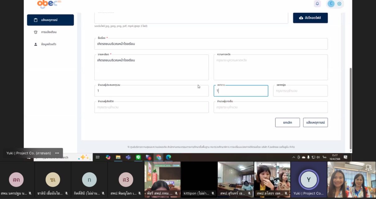 วันพฤหัสบดีที่ 10 เมษายน 2568 ว่าที่ร้อยตรี สุรสิทธิ์ ถิตย์สมบูรณ์ ผู้อำนวยการสำนักงานเขตพื้นที่การศึกษาประถมศึกษากาฬสินธุ์ เขต 1 มอบหมายให้ นางกฤตราพร ธรรมวงศา ผู้อำนวยการกลุ่มส่งเสริมการจัดการศึกษา นางสาวนพมาส ผาสุขเลิศ นักวิชาการศึกษาชำนาญการ และนางสราลี พจนนุสนธิ์ นักจิตวิทยาโรงเรียน ประจำสพป.กาฬสินธุ์ เขต 1 เข้าร่วมประชุมเพื่อเรียนรู้ระบบ OBEC safety center ผ่านระบบออนไลน์ (Zoom Meeting)