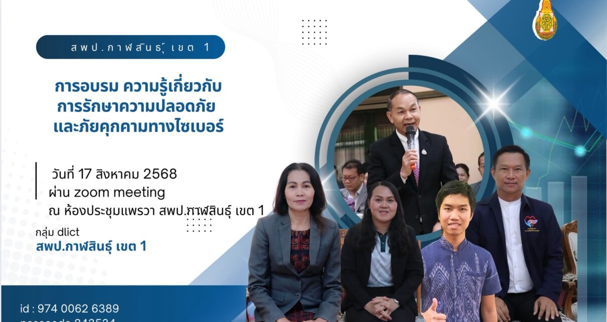 วันอาทิตย์ ที่ 17 สิงหาคม 2568 ว่าที่ร้อยตรี สุรสิทธิ์ ถิตย์สมบูรณ์ ผู้อำนวยการสำนักงานเขตพื้นที่การศึกษาประถมศึกษากาฬสินธุ์ เขต 1 เป็นประธานพิธีเปิด การอบรมให้ความรู้ความตระหนักด้านภัยคุกคามทางไซเบอร์ (Cyber) โดยมี ดร.นุกูล ทรงมงคลรัตน์ รองผู้อำนวยการสำนักงานเขตพื้นที่การศึกษาประถมศึกษากาฬสินธุ์ เขต 1 กล่าวรายงาน พร้อมด้วย นางกัญญาภัทร นาชัยนาค ผอ.กลุ่ม DLICT นางสาวสุชญา สุริยะสาร พนักงานราชการ ร่วมการอบรม ดังกล่าว ณ ห้องประชุมแพรวา โดยมี นายเจษฎา สุขจันดี ครูโรงเรียนนาสีนวลโสกทรายวิทยา เป็นวิทยากร ซึ่งกลุ่มเป้าหมายในการอบรม ได้แก่ ครูผู้รับผิดชอบและผู้สนใจเพื่อป้องกันภัยทางไซเบอร์ โรงเรียนในสังกัด จำนวน 161 โรงเรียน ผ่านระบบ ZOOM